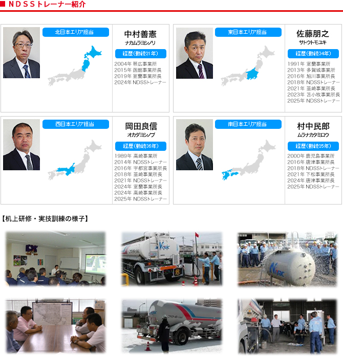 当社では、事故の予防に特化した安全指導に関する専門スタッフである NDSSトレーナー(Niyac Drivres Safety School)を全国に配置するとともに、新人ドライバー指導の専属スタッフとして NDFSトレーナー(Niyac Drivres Freshman School)を配置しています。 NDSSトレーナーは年間を通じて各拠点を訪問し、協力会社を含む全てのドライバーを対象に体系化された研修カリキュラムや安全教材に基づき、机上研修・実技訓練を行うことで“Safety is our business”の実現を目指しています。 また、NDFSトレーナーは、年間100名以上に及ぶ当社に新しく入社する新人ドライバーに対する基礎的指導を専属的に行い、均一化された安全レベルの実現を目標にしています。