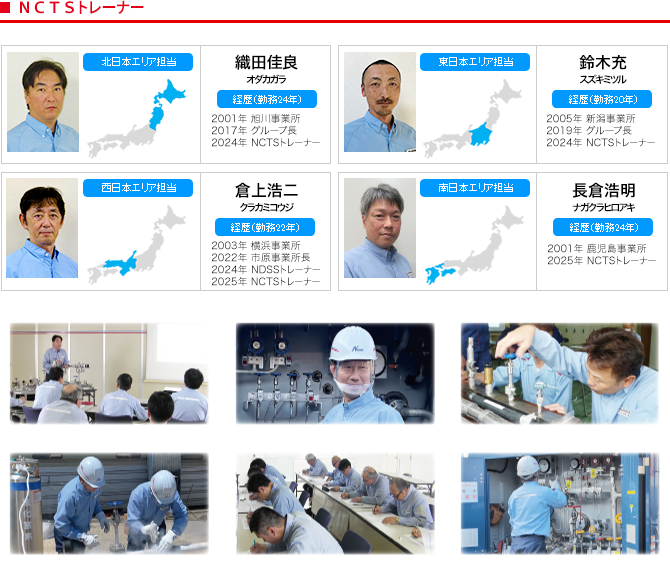 NCTS(Niyac Cryogenic Technical School)は、高圧ガス物流のなかにおいて、とりわけ超低温の高圧ガス物流に関する幅広い知識や技能を習得するための当社独自の研修制度です。 全国に研修スタッフである NCTSトレーナーを配置し、関係法令・製品知識・特性などに関する講義、カットモデルを用いた車両・資機材の構造理解を深めるための机上研修のほか、充填・荷卸訓練、非常時の対応などを習得するための実技訓練を行なうことにより、国内最大規模を誇るニヤクコーポレーショングループの高圧ガス物流サービスの品質を支えています。